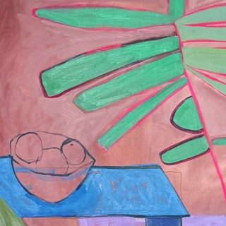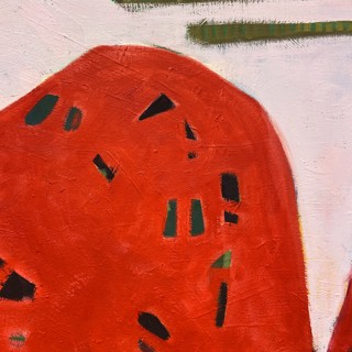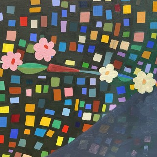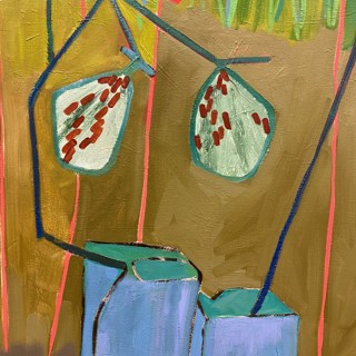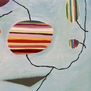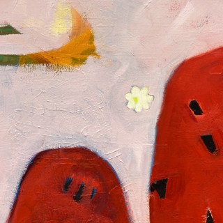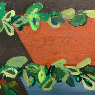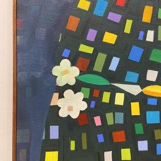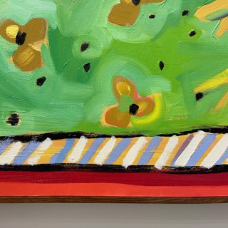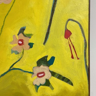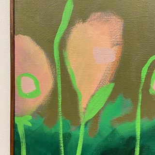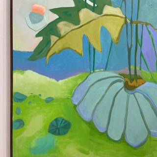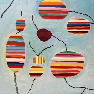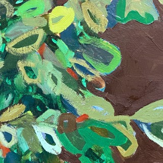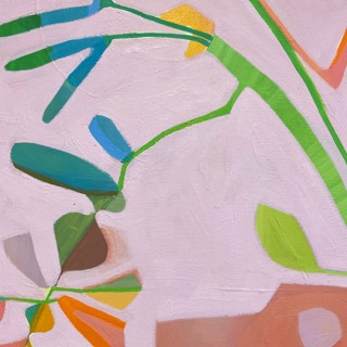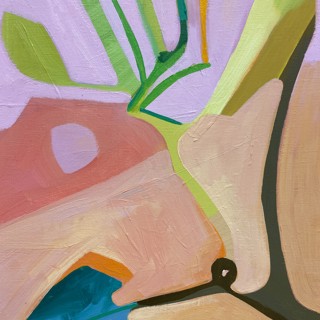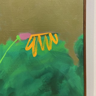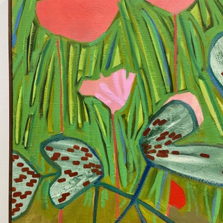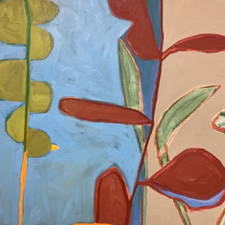 Susan’s practice centers on creating bold, luminous passages of color guided by instinct, energy, and play. Elements drawn from travel occasionally emerge—an echo of a bonsai encountered in Japan, a fleeting botanical form recalled rather than directly observed. These fragments drift through the compositions as part of a broader emotional landscape where growth, attunement, and joy exist in a quiet, shifting balance.